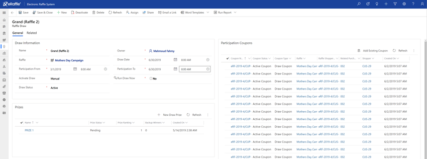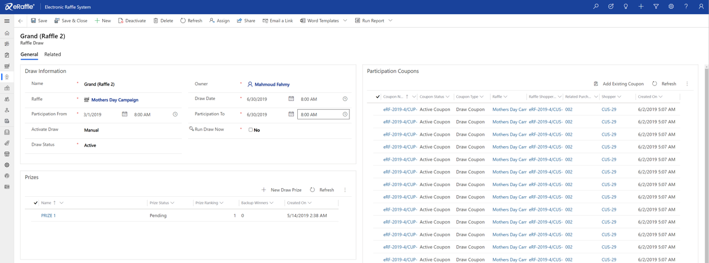 These two fields define the period which generated coupons will be assigned to this draw. Any coupons that will be generated during this period will be assigned automatically to this raffle draw if it was active to Active Status.