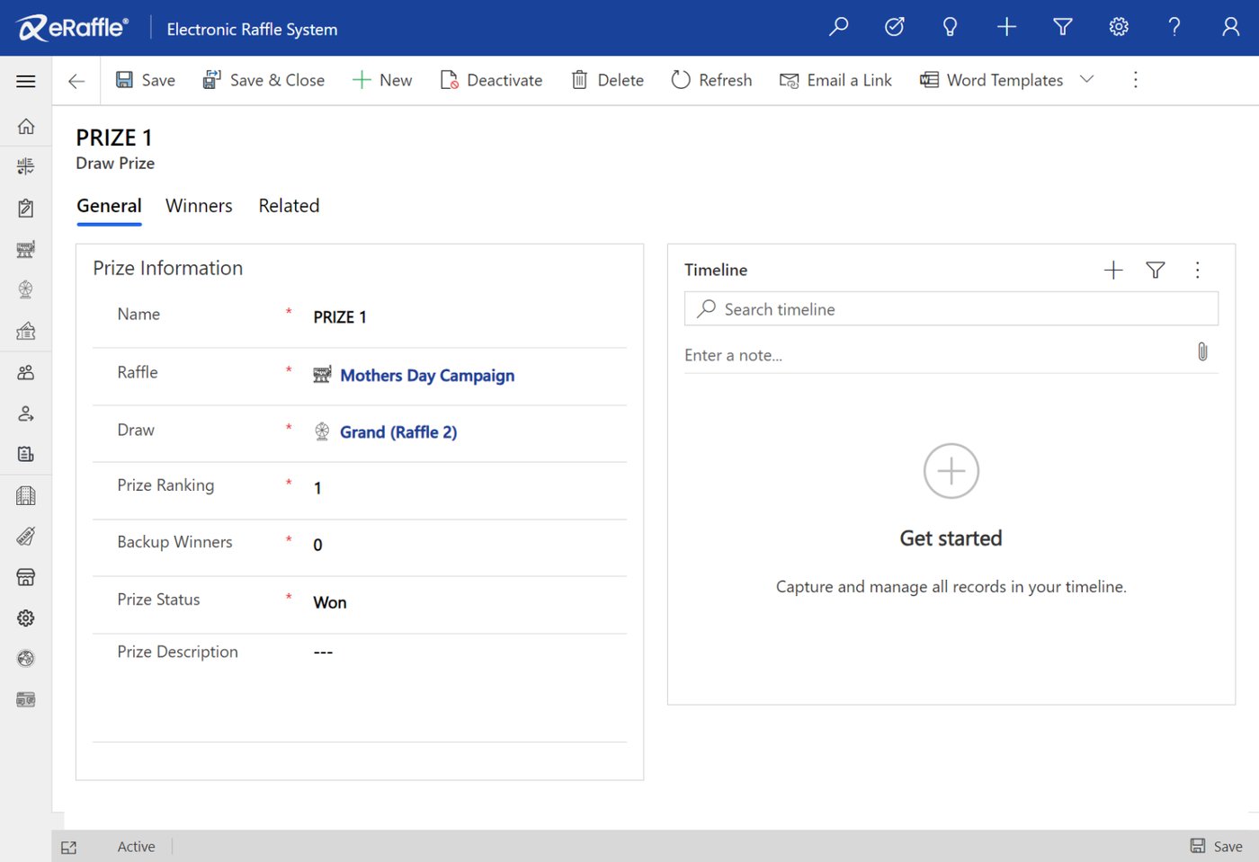 - Fill in the required Draw Prize Information, and click the “Save” button, on the top action menu.