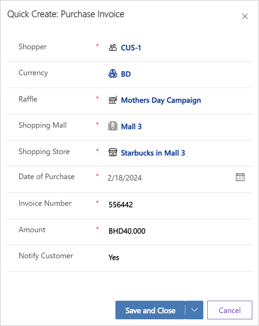 The system will process Purchase Invoices and generate coupons for them by default. Except if the total number of coupons exceeds the limitation configured with the Raffle campaign’s “Max No. of Coupons Per Invoice”.