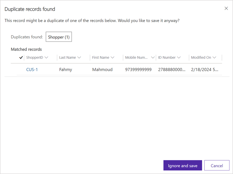 The system can automatically detect potential duplicates while creating Shoppers records, by matching any of the following Shopper’s information: